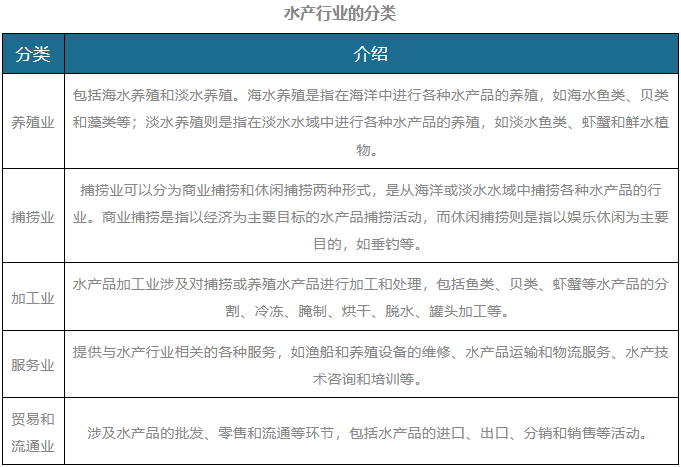水产行业是指涉及水产品的生产、养殖、捕捞、加工、贸易及相关服务等一系列经济活动的产业,包括海洋水产业和淡水水产业,涵盖从水域中获取和养殖水产品到产品加工及销售等环节。水产/水产加工品分类有鲜活品、冷冻品、干制品、腌制品等。水产行业可分为捕捞业、养殖业、加工业、贸易和流通业、服务业。