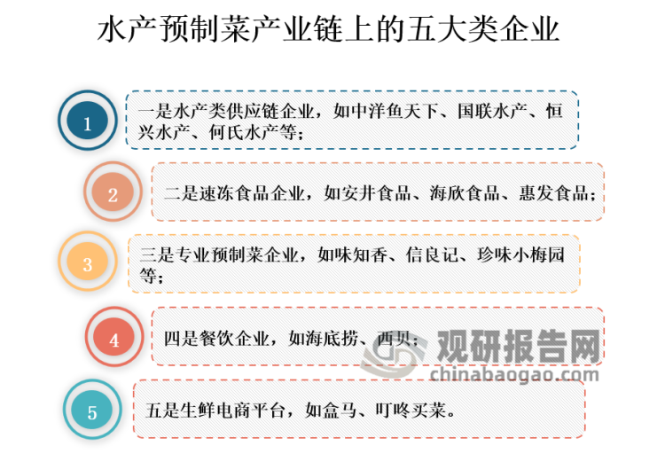 此前,海天味业在官方旗舰店推出了“金汤酸菜鱼”和“青花椒烤鱼”两款水产预制菜产品;近日,盒马也正式发布水产预制菜系列新品“盒马宝鲜”,推出了一系列水产预制菜。生产端,国联水产自深度布局水产预制菜以来,已经打造出面包虾、调味小龙虾、烤鱼、酸菜鱼等亿元级销量大单品;河南的预制菜企业农都农业、澳嘉食品也在今年扩大产能,进一步加码小龙虾、甲鱼等水产预制菜。目前水产预制菜整条产业链上主要涉及五大类企业,其中,水产类企业有多年的收购存储原料的经验,资金实力雄厚,可以为稳定的原料供应提供保障。