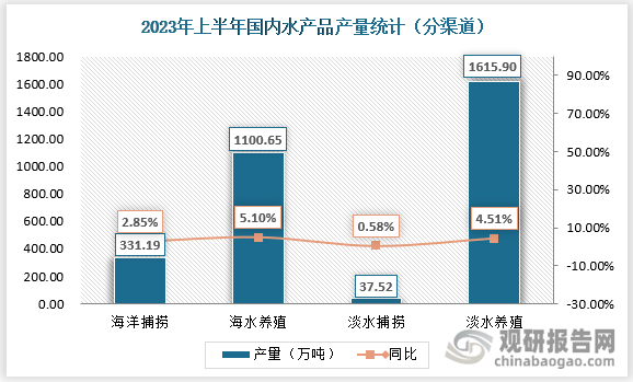我国是世界第一水产养殖大国,自1989年起,我国水产品产量跃居世界第一位,已经连续33年保持世界首位。2022年尽管受到疫情影响,海洋水产品需求日益增长,产量持续增加。2022年全国海洋水产品产量同比增长2.4%,水产品进口额同比增长40.6%,远洋渔业产品运回国内销量占比不断提升。进入2023年,行业发展延续良好势头,为“菜篮子”产品稳定供给和农业农村经济发展作出积极贡献。上半年水产品产量稳步增长,市场成交量额双增,价格略有上涨,水产品出口额同比下降,进口额较快增长,贸易逆差持续,渔民收入稳步增长,休闲渔业快速复苏。