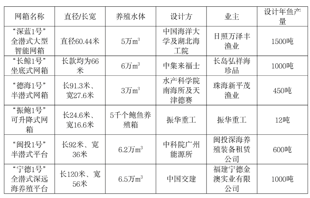 目前我国海洋牧场的主要载体包括了近岸的HDPE网箱、人工渔礁、大型智能网箱、大围网、养殖工船等以及陆地配套的工厂化循环水。其中HDPE网箱整体投入成本较低,比较适合小的渔业公司和渔户用于养殖,并且适合在台风少且没有冰期的区域,一旦台风较强且频繁或是遭遇浮冰,HDPE网箱很容易被摧毁。而人工渔礁类海洋牧场多为增殖性质,难以捕捞,比较适合公益性或者北方海珍品养殖,或者配合垂钓平台进行南北方休闲垂钓。从将来产业化趋势看,大型智能网箱、围栏式海洋牧场、养殖工船等与陆地工厂化循环水陆海统筹、南北联动的模式是最佳的,因此本文仅重点介绍大型智能网箱、围栏式海洋牧场、养殖工船三种载体。这三种载体对不同鱼种及区域各有优劣,但又可在特定鱼种及区域中进行有效结合,如养殖工船可作为大型智能网箱综合运输及补给设施,大型智能网箱、围栏式海洋牧场可有效扩大养殖工船养殖水体。自挪威SalMar公司投资建造并已投产使用大型半潜式养殖网箱“Ocean Farm”后,国内的大型智能网箱如雨后春笋般冒出呈现;如以武船重工为代表的大型全潜式深海智能网箱“深蓝1号”,中集来福士为代表的智能化海洋牧场综合体平台“耕海1号”、智能化坐底式网箱“长鲸一号”以及后续的经海系列,振华重工为代表的深远海鲍鱼养殖平台“振鲍1号”、黄鱼养殖网箱“振渔1号”,中科院广州能源研究所为代表的半潜式波浪能养殖网箱“澎湖号”、“闽投1号”、“普盛1号”,中国水产科学院南海所、天津德赛研发的“德海1号”,中国交建为代表的智能深远海网箱“深蓝2号”、“宁德1号”。其中,中国交建自主研发建造的“宁德1号”网箱是国内首个超大型全潜式海上智慧平台,拥有6项国家专利,是目前国内较大的深远海养殖装备,受到了地方政府及媒体的高度关注。