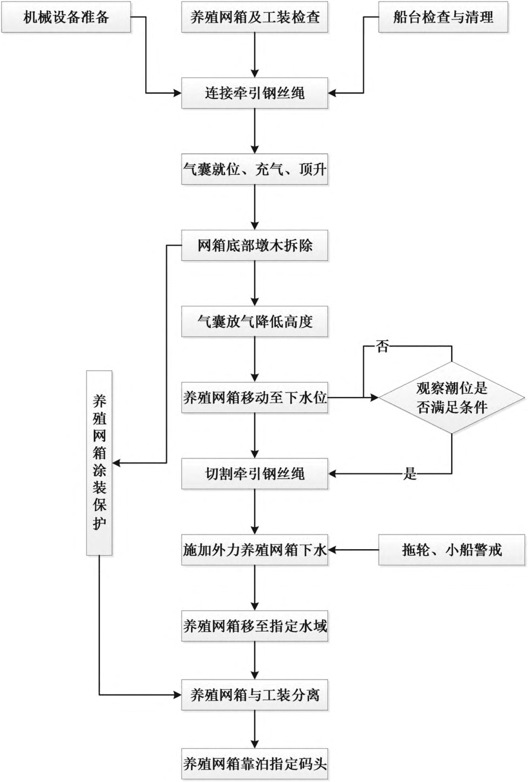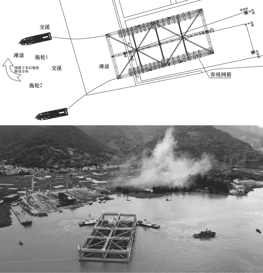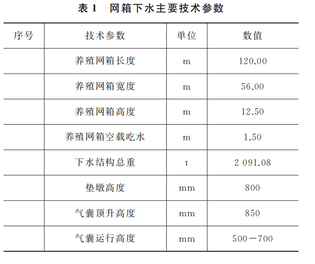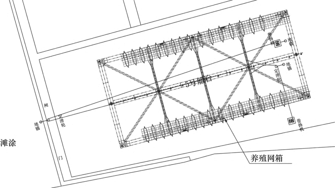 养殖网箱能否安全下水将是制约网箱建造的关键问题之一,传统船舶下水的主要方式有:船台滑道下水、船坞直接下沉下水(分为干船坞和船坞)、气囊下水、侧向下水等,对于造船业来说,上述下水方式技术较为成熟,均在实践中进行了多次应用。但对于养殖网箱来说,由于受到养殖功能的要求,养殖网箱相比于传统船舶,主体结构更为分散、宽度更大,故而养殖网箱的下水难度更大,对下水作业的安全性提出了更高的要求,为此,本文基于项目实际情况就大型框架式养殖网箱船台下水施工工艺及施工过程控制进行论述,为后续其他类似项目提供项目经验。 1项目概况 宁德深远海养殖平台项目网箱建造地址位于福建省宁德市。网箱养殖水体约65000m3,长120m,宽56m,型深12.5m,按照中国船级社相关规范进行建造,养殖网箱和下水工装均安放于船台,待养殖网箱具备下水条件后,开展下水作业。 网箱下水主要技术参数如表1. 2 下水方案研究及选择 由于深远海养殖网箱具有占地面积大、结构分散的特点,网箱建造工作受建造场地的限制较多,基于此,结合宁德深远海养殖平台项目实际情况,综合对比国内目前较为成熟的船舶建造及下水工艺,选用船台建造、气囊下水的施工工艺进行网箱的建造施工。气囊下水属于国内船只下水所采用最普遍的方案之一,基本上涵盖了大部分民用船舶,即便是五万吨级别以上的船舶,也可以利用该项技术完成下水,较为典型的是国内自行设计、建造的首艘大吨位自航式半潜船“希望之路”采用气囊下水技术,该船总长156m,型宽36m,型深10m,下水重量达12900t。gw-ocean 网箱主体为由3m、2m和1m直径钢管组装的框架式结构,网箱纵向结构为3m直径钢管,在养殖平台底部直接铺设气囊将会面临以下问题: (1)养殖平台底部钢管结构与气囊接触面积较小,导致气囊承载力不足。 (2)底部钢管结构导致气囊两端上翘,气囊与地面的接触面积减小;且移动方向容易发生跑偏。 (3)底部钢管结构侧面悬挂渔网,气囊滚动可能导致渔网破损。 为解决以上问题,提出以下解决措施: (1)在养殖平台底部两侧3m钢管下各设置一个下水平台,该平台主体结构为一个长方形箱体,并在上部设置支墩用以支撑养殖平台,底部为平面,增大其与气囊的接触面积。 (2)两侧下水平台底部设置横向加强横梁,使得下水工装成为一个整体,保证下水过程中整体结构同步。 (3)横向加强横梁设置支墩,为中纵结构提供一定支撑,一定程度上降低中纵结构的局部应力。 (4)下水平台为钢制板架结构,内部设置压载舱,下水后可向压载舱内部注水,使得下水平台下沉,从而与养殖平台分离。 (5)下水平台与养殖平台分离后,可通过压缩空气排出压载水,自由上浮,有效回收使用。 3 关键施工技术 养殖网箱气囊下水施工工艺流程如图1所示,主要包含施工准备、牵引钢丝绳连接、气囊就位及顶升、养殖网箱移位、养殖网箱下水及拖带、养殖网箱与下水工装分离等流程,以下针对下水过程中的关键施工技术进行介绍。 图1 施工工艺流程图 3.1 下水工装布置及绑扎 由于养殖网箱主体由圆管组成,气囊承载压力面不满足要求,特制专用下水平台,网箱两侧底部各布置一个平台(钢制浮力平台),平台尺寸105m×8m×1.5m,平台上部根据网箱结构在加强位置布置支墩,下水平台在养殖网箱主体合拢前先测量定位安装到位,养殖网箱主体在平台面上画线拼装,同时在两个下水平台之间安装加强工装结构,工装结构如图2所示。 图2 下水工装示意图 网箱与下水工装的绑扎按照组合体横倾5°、纵倾2°的载荷进行设计。在布置气囊前,按照设计图纸使用工字钢等焊接限位结构,网箱与支墩、限位结构的接触面应设置垫木,避免造成网箱外部油漆损伤(图3)。 图3 绑扎设计图 3.2 钢丝绳连接 根据CB/T3837-2011,下水移船时系船钢丝绳承受的最大拉力按公式1[5]计算: 绞车钢丝绳牵引力按以下公式2[3]校核: 式中: F为下水移船时钢丝绳最大拉力的数值,单位为千牛(kN);α为气囊承托的船舶在坡道上产生的倾角的数值,单位为度(°);μ为气囊滚动阻力系数,由坡道坡度、地面材质、气囊结构、内压、摆放等诸多因素确定;V为移船速度的数值,单位为米每秒(m/s);T为绞车制动响应时间的数值,单位为秒(s);Fc为绞车钢丝绳牵引力的数值,单位为千牛(kN);K为安全系数,K=1.2~1.5;Nc为滑轮组上的钢丝绳道数;β为绞车牵引钢丝绳与F方向的夹角,单位为度(°),一般不大于6°。 经计算,为防止网箱下滑,需施加的外力F1为: 根据计算结果,由于摩擦力较大,气囊顶升之后,网箱将会静止于船台上,但是为了防止网箱移位过快,设置卷扬机及滑轮组以控制移位速度。网箱移位时,需提供的初始外力F2为: 基于上述计算结果,在艏部加强横梁前装焊一个200kN的吊钩,吊钩两侧简距5m位置各安装1个100kN的眼板,选用D卸扣(许用负荷大于100kN)、直径40mm圆股钢丝绳(船厂50t卷扬机自带)。gw-ocean 在闸口处设置一个地锚和定滑轮,在网箱艏部中纵部位两侧地面各设置1个地锚,在网箱艏部地锚附近设置1个20t卷扬机,然后连接钢丝绳,穿过1个定滑轮后与焊接在艏部加强横梁中部的吊钩连接(构成自脱钩装置),形成为网箱移位提供下移牵引力的牵引系统1。 在网箱艏部右舷设置50t卷扬机,连接钢丝绳穿过艏部右舷定滑轮,与焊接在艏部加强横梁前部的2个眼板连接,形成移位制动牵引系统2,用以防止网箱移位速度过快,为网箱移位减