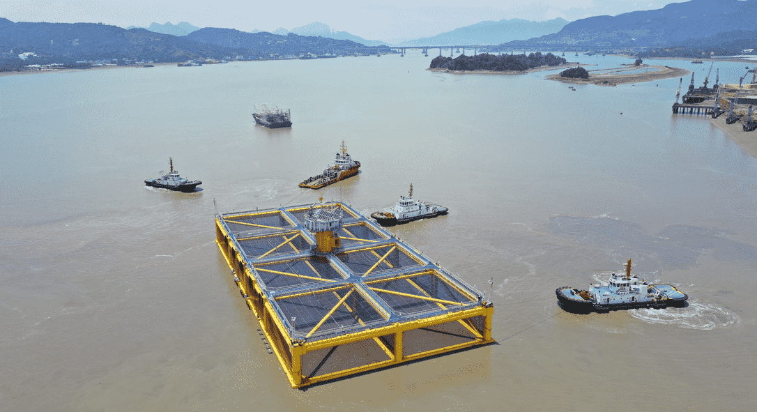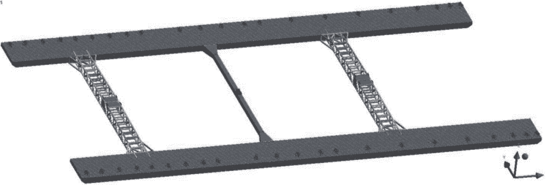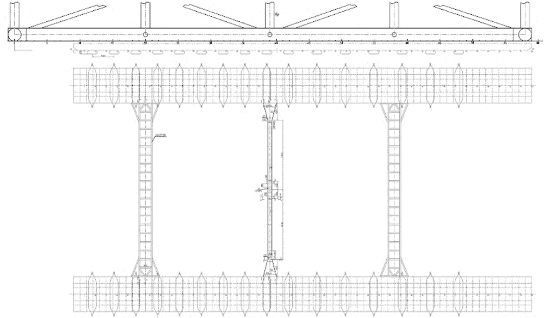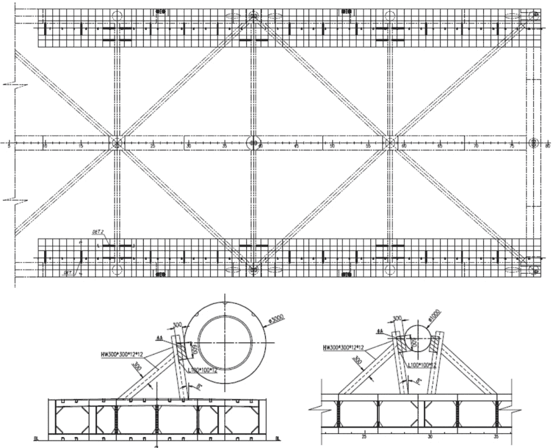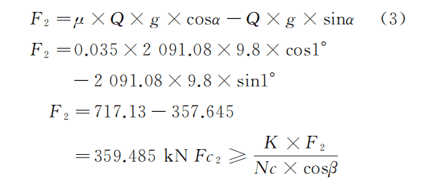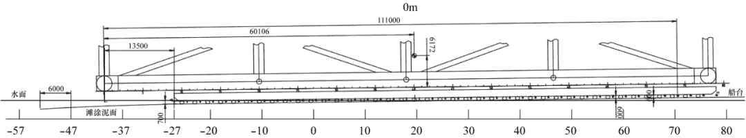 养殖网箱能否安全下水将是制约网箱建造的关键问题之一,传统船舶下水的主要方式有:船台滑道下水、船坞直接下沉下水(分为干船坞和船坞)、气囊下水、侧向下水等,对于造船业来说,上述下水方式技术较为成熟,均在实践中进行了多次应用。但对于养殖网箱来说,由于受到养殖功能的要求,养殖网箱相比于传统船舶,主体结构更为分散、宽度更大,故而养殖网箱的下水难度更大,对下水作业的安全性提出了更高的要求,为此,本文基于项目实际情况就大型框架式养殖网箱船台下水施工工艺及施工过程控制进行论述,为后续其他类似项目提供项目经验。 1项目概况 宁德深远海养殖平台项目网箱建造地址位于福建省宁德市。网箱养殖水体约65000m3,长120m,宽56m,型深12.5m,按照中国船级社相关规范进行建造,养殖网箱和下水工装均安放于船台,待养殖网箱具备下水条件后,开展下水作业。 网箱下水主要技术参数如表1. 2 下水方案研究及选择 由于深远海养殖网箱具有占地面积大、结构分散的特点,网箱建造工作受建造场地的限制较多,基于此,结合宁德深远海养殖平台项目实际情况,综合对比国内目前较为成熟的船舶建造及下水工艺,选用船台建造、气囊下水的施工工艺进行网箱的建造施工。气囊下水属于国内船只下水所采用最普遍的方案之一,基本上涵盖了大部分民用船舶,即便是五万吨级别以上的船舶,也可以利用该项技术完成下水,较为典型的是国内自行设计、建造的首艘大吨位自航式半潜船“希望之路”采用气囊下水技术,该船总长156m,型宽36m,型深10m,下水重量达12900t。gw-ocean 网箱主体为由3m、2m和1m直径钢管组装的框架式结构,网箱纵向结构为3m直径钢管,在养殖平台底部直接铺设气囊将会面临以下问题: (1)养殖平台底部钢管结构与气囊接触面积较小,导致气囊承载力不足。 (2)底部钢管结构导致气囊两端上翘,气囊与地面的接触面积减小;且移动方向容易发生跑偏。 (3)底部钢管结构侧面悬挂渔网,气囊滚动可能导致渔网破损。 为解决以上问题,提出以下解决措施: (1)在养殖平台底部两侧3m钢管下各设置一个下水平台,该平台主体结构为一个长方形箱体,并在上部设置支墩用以支撑养殖平台,底部为平面,增大其与气囊的接触面积。 (2)两侧下水平台底部设置横向加强横梁,使得下水工装成为一个整体,保证下水过程中整体结构同步。 (3)横向加强横梁设置支墩,为中纵结构提供一定支撑,一定程度上降低中纵结构的局部应力。 (4)下水平台为钢制板架结构,内部设置压载舱,下水后可向压载舱内部注水,使得下水平台下沉,从而与养殖平台分离。 (5)下水平台与养殖平台分离后,可通过压缩空气排出压载水,自由上浮,有效回收使用。 3 关键施工技术 养殖网箱气囊下水施工工艺流程如图1所示,主要包含施工准备、牵引钢丝绳连接、气囊就位及顶升、养殖网箱移位、养殖网箱下水及拖带、养殖网箱与下水工装分离等流程,以下针对下水过程中的关键施工技术进行介绍。 图1 施工工艺流程图 3.1 下水工装布置及绑扎 由于养殖网箱主体由圆管组成,气囊承载压力面不满足要求,特制专用下水平台,网箱两侧底部各布置一个平台(钢制浮力平台),平台尺寸105m×8m×1.5m,平台上部根据网箱结构在加强位置布置支墩,下水平台在养殖网箱主体合拢前先测量定位安装到位,养殖网箱主体在平台面上画线拼装,同时在两个下水平台之间安装加强工装结构,工装结构如图2所示。 图2 下水工装示意图 网箱与下水工装的绑扎按照组合体横倾5°、纵倾2°的载荷进行设计。在布置气囊前,按照设计图纸使用工字钢等焊接限位结构,网箱与支墩、限位结构的接触面应设置垫木,避免造成网箱外部油漆损伤(图3)。 图3 绑扎设计图 3.2 钢丝绳连接 根据CB/T3837-2011,下水移船时系船钢丝绳承受的最大拉力按公式1[5]计算: 绞车钢丝绳牵引力按以下公式2[3]校核: 式中: F为下水移船时钢丝绳最大拉力的数值,单位为千牛(kN);α为气囊承托的船舶在坡道上产生的倾角的数值,单位为度(°);μ为气囊滚动阻力系数,由坡道坡度、地面材质、气囊结构、内压、摆放等诸多因素确定;V为移船速度的数值,单位为米每秒(m/s);T为绞车制动响应时间的数值,单位为秒(s);Fc为绞车钢丝绳牵引力的数值,单位为千牛(kN);K为安全系数,K=1.2~1.5;Nc为滑轮组上的钢丝绳道数;β为绞车牵引钢丝绳与F方向的夹角,单位为度(°),一般不大于6°。 经计算,为防止网箱下滑,需施加的外力F1为: 根据计算结果,由于摩擦力较大,气囊顶升之后,网箱将会静止于船台上,但是为了防止网箱移位过快,设置卷扬机及滑轮组以控制移位速度。网箱移位时,需提供的初始外力F2为: 基于上述计算结果,在艏部加强横梁前装焊一个200kN的吊钩,吊钩两侧简距5m位置各安装1个100kN的眼板,选用D卸扣(许用负荷大于100kN)、直径40mm圆股钢丝绳(船厂50t卷扬机自带)。gw-ocean 在闸口处设置一个地锚和定滑轮,在网箱艏部中纵部位两侧地面各设置1个地锚,在网箱艏部地锚附近设置1个20t卷扬机,然后连接钢丝绳,穿过1个定滑轮后与焊接在艏部加强横梁中部的吊钩连接(构成自脱钩装置),形成为网箱移位提供下移牵引力的牵引系统1。 在网箱艏部右舷设置50t卷扬机,连接钢丝绳穿过艏部右舷定滑轮,与焊接在艏部加强横梁前部的2个眼板连接,形成移位制动牵引系统2,用以防止网箱移位速度过快,为网箱移位减