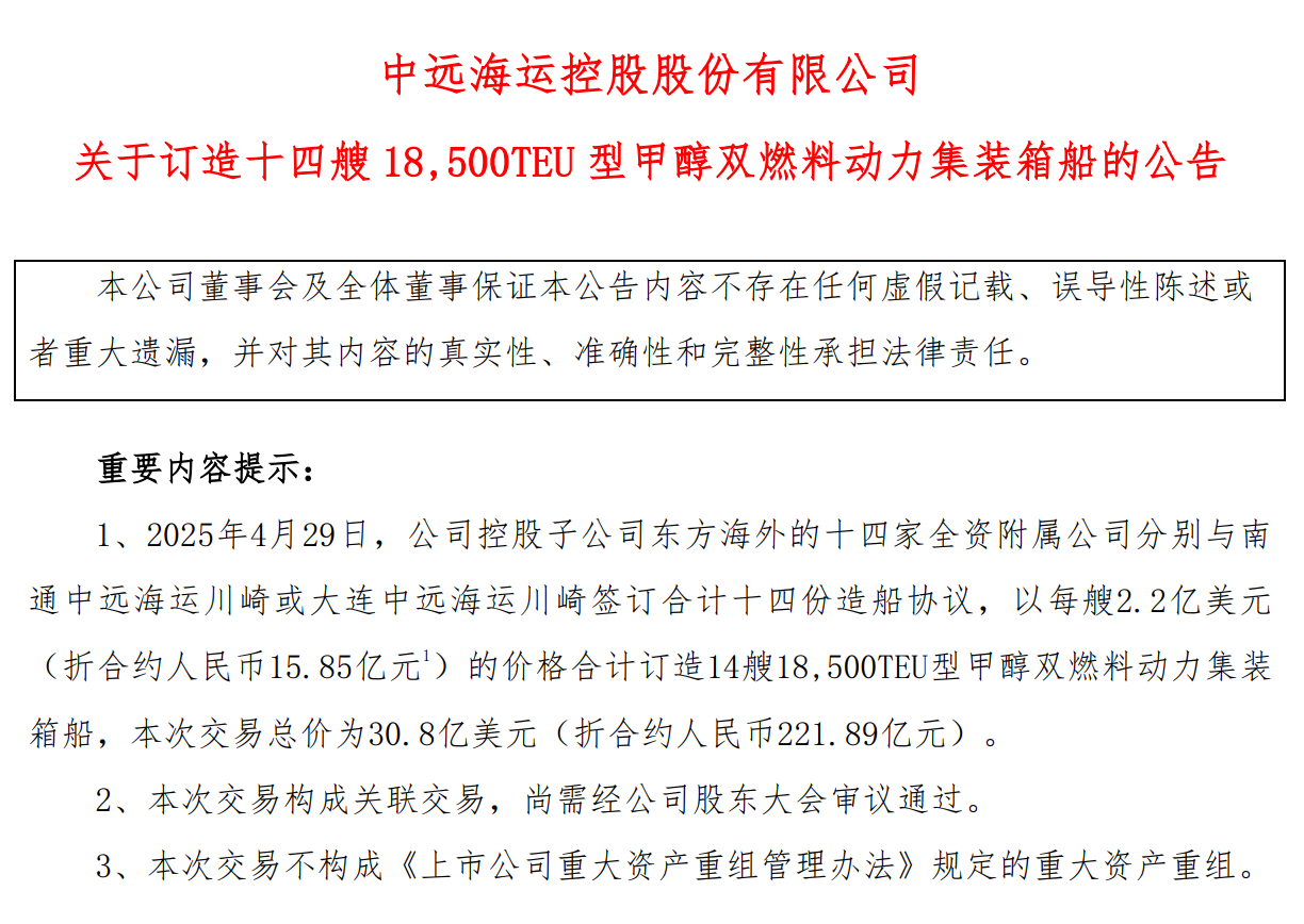 4月29日,中远海运控股股份有限公司发布公告称,该公司控股子公司东方海外(国际)有限公司正式订造14艘18500TEU甲醇双燃料动力集装箱船,交易总价30.8亿美元(约合人民币221.89亿元)。